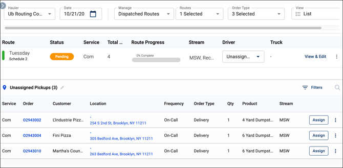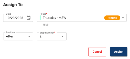 In List View, scroll down to the Unassigned Pickups list. Click Assign and a flyout panel will appear and allow you to choose the date, route, and position of the pickup.