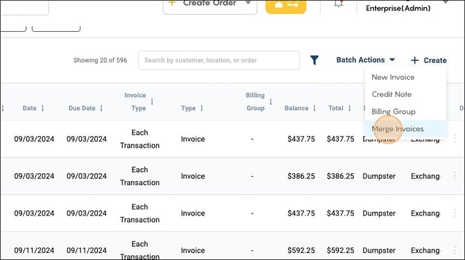 Invoices must be in the Needs Review Billing tab before they can be merged. To do this, click the three dots on the far right of the Invoice row and select Needs Review from the dropdown menu.