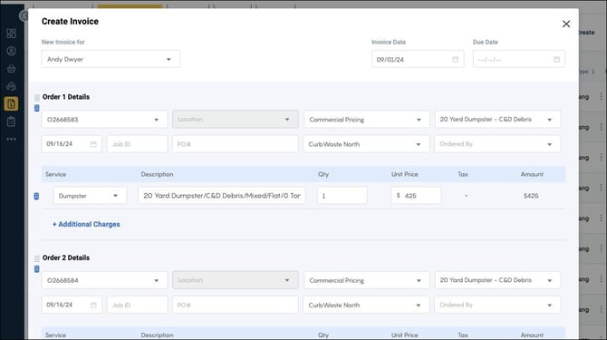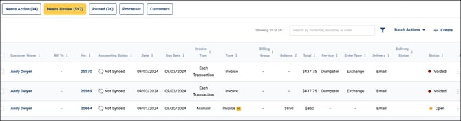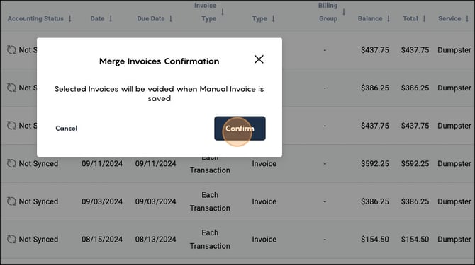 Invoices from the same customer can be merged in the Needs Review tab of the main Billing page or in your customer's billing profile. The original copies of the invoices will be voided and a new, manual invoice will be created.